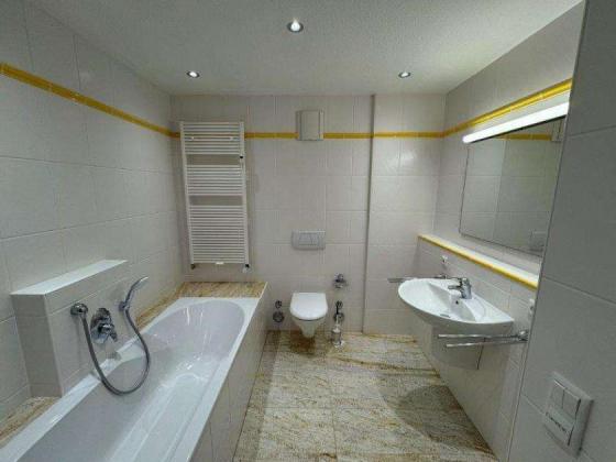 Großes Bad, separates Gäste-WC. Helles Kinderzimmer (auch anders nutzbar) und Schlafzimmer mit neuwertigem Laminatboden. Küche, Flur, Diele/Garderobe, Bad und Gäste-WC mit exklusivem Natursteinboden. Wohnzimmer mit hochwertigem LVT-Belag.