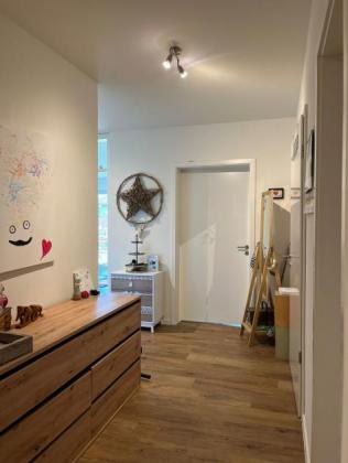 Die Aufteilung umfasst einen einladenden Flur, ein Gäste-WC, ein modernes Badezimmer mit Dusche und hochwertigem Glas-Spritzschutz, ein geräumiges Schlafzimmer, ein großzügiges Wohn- und Esszimmer mit direktem Zugang zur Terrasse, eine separate Küche inklusive moderner Einbauküche sowie einen vielseitig nutzbaren Allzweckraum. Ein praktischer Abstellraum innerhalb der Wohnung bietet zusätzlichen Stauraum.