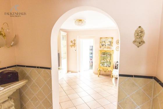 Die Bodenbeläge bestehen fast ausschließlich aus hochwertigen Travertin-Fliesen. Die Wände sind hauptsächlich verputzt und gestrichen. Die Wände der Diele sind im unteren Bereich gefliest.