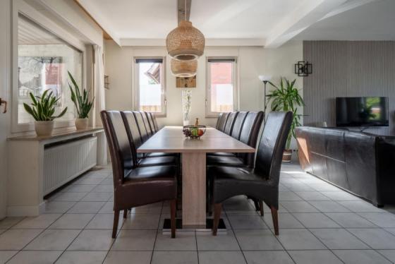 Das großzügige, lichtdurchflutete Wohnzimmer bildet das Herzstück des Hauses. Große Fensterflächen sorgen für eine angenehme Helligkeit und einen schönen Blick ins Grüne. Die separate Küche ist funktional gestaltet und bietet Potenzial für eine Modernisierung oder den Umbau zu einer offenen Wohnküche – perfekt für alle, die modernes Wohnen mit gemütlicher Atmosphäre verbinden möchten.