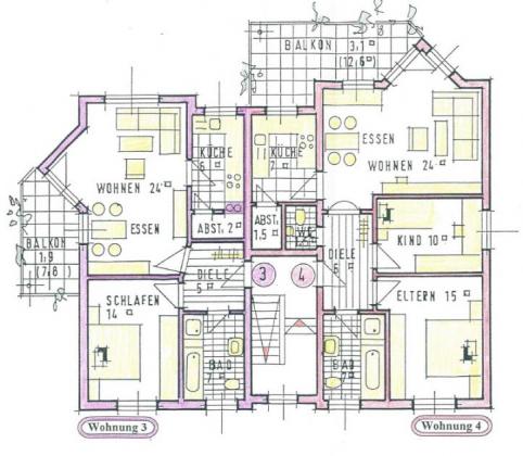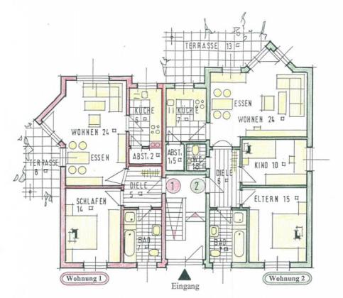 Das Erdgeschoss beherbergt jeweils eine Zweiraum- und eine Dreiraumwohnung. Beide sind gut geschnitten und bieten ausreichend Platz für eine kleine Familie oder Paare. Jede Wohnung verfügt über ein gemütliches Wohnzimmer, ein Schlafzimmer, eine Küche und ein Bad, sowie einen praktischen Abstellraum, der zusätzlichen Stauraum für diverse Utensilien bietet.