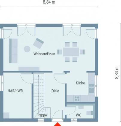 Stadtvilla 11 mit Satteldach überzeugt mit puristischer Sachlichkeit und mit ihrer schnörkellosen Architektur. Die beginnt beim quadratischen Grundriss, setzt sich durch die klaren Linien in der Außenfassade fort und findet im Inneren ihre Vollendung: Im Erdgeschoss beeindruckt der große und helle Wohn-Ess-Bereich mit direktem Zugang zum Garten und sich direkt anschließender Küche. Außerdem im Erdgeschoss: Ein mehr als 10 m² großer Hauswirtschaftsraum sowie ein Gäste-WC. In der Diele führt eine Treppe ins Obergeschoss und dort direkt in die Galerie, von der der Zugang zu allen Zimmern möglich wird. Im Detail sind das: zwei Kinderzimmer, ein großes Elternschlafzimmer sowie ein Bad mit Dusche, WC und Badewanne - und das bietet mit über 11 m² Fläche Platz für die ganze Familie. Stadtvilla 11 - ein echter Wohlfühlort inmitten des Großstadttrubels.