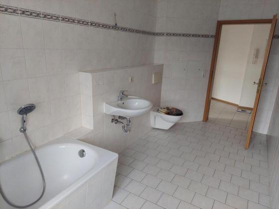 Das große Bad verfügt über eine Wanne, WC, WM Anschluss , Waschtisch und ein Fenster sowie Boden und Wandfliesen.