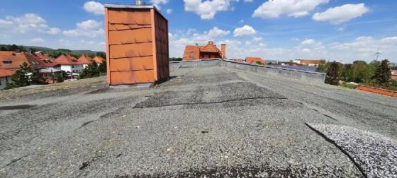 Es handelt sich um ein Flachdach, welches mit Bitumbahnen gedeckt ist.