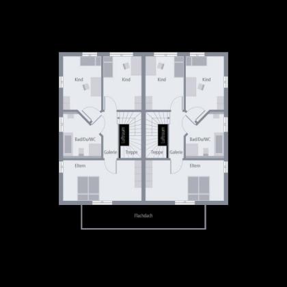 Unter dem Walmdach bieten zwei achsensymmetrische Haushälften unbeschwertes und exklusives Wohnen. Die durchdachte Grundrissgestaltung eignet sich sowohl für Familien mit Kindern als auch für Paare, die Zusatzräume für Home-Office, Hobby oder Gäste benötigen. Das Erdgeschoss ist in einen Nutz- und den großflächigen Wohnbereich mit offener Küche unterteilt. Der mittige Fassadenvorsprung sorgt für trockenen Zutritt und lockert die geradlinige Architektur ansprechend auf. Im Obergeschoss stehen das Schlafzimmer, ein Wellnessbad sowie zwei weitere Zimmer für individuelle Raumaufteilung zur Verfügung.