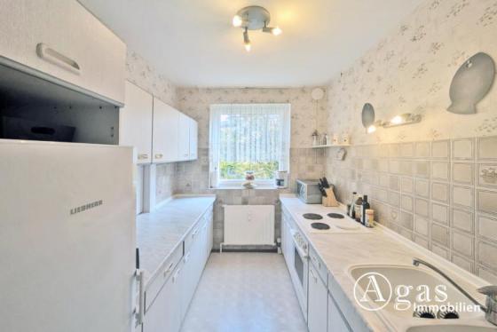 Das Badezimmer mit Fenster, geradezu im Flur, verfügt über eine Badewanne mit Dusche sowie eine Waschmaschine. Die Küche mit ihrem funktionalen Design verfügt ebenfalls über ein Fenster und die bereits erwähnte Durchreiche, die den Raum perfekt mit dem Essbereich verbindet, sorgt für ein offenes, kommunikatives Wohnkonzept.