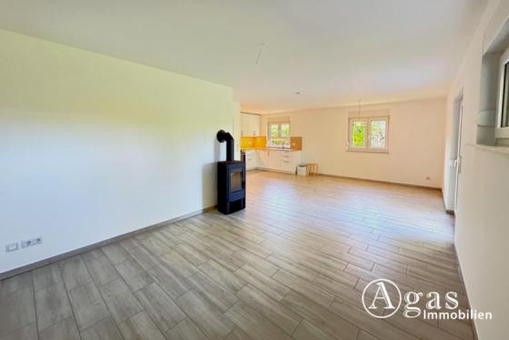 Am Ende des Flures öffnet sich die großzügige Wohnküche, die mit ihrer offenen Gestaltung ein einladendes Raumgefühl vermittelt. Der Kamin im Wohnbereich schafft eine gemütliche Atmosphäre, während der direkte Zugang zur Terrasse und zum Garten fließende Übergänge zwischen Innen- und Außenbereich ermöglicht.