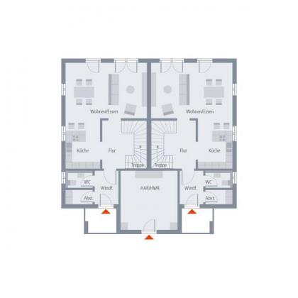 Der einladende Eingangsbereich umfasst einen praktischen Windfang, einen Abstellraum sowie ein Gäste-WC und führt direkt in den zentralen Flur. Von hier aus öffnet sich der lichtdurchflutete Wohn- und Essbereich mit integrierter Küche, der beiden Parteien einen direkten Zugang zum Außenbereich ermöglicht.