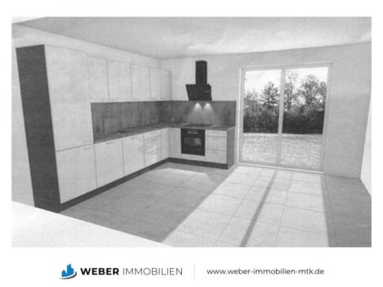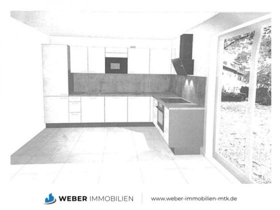 Der Küchenbereich ist durch pflegeleichte Fliesen in Grau optisch vom Wohnzimmer getrennt. In den kommenden Wochen wird eine neue Einbauküche in L-Form eingebaut, die mit Einbaukühlgefrierkombi, 60er Geschirrspüler, Einbaumikrowelle, Induktionskochfeld und Backofen komplett ausgestattet ist.