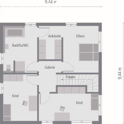 Von der großen Diele mit separatem Garderobenbereich führt eine halbgewendelte Treppe ins Obergeschoss - und direkt in die kleine, aber feine Galerie, von der es direkte Zugänge in die vier Räume gibt: zwei Kinderzimmer, ein großes Bad mit Wanne, Dusche und WC sowie den Bereich der Eltern mit Schlaf- und Ankleidezimmer.