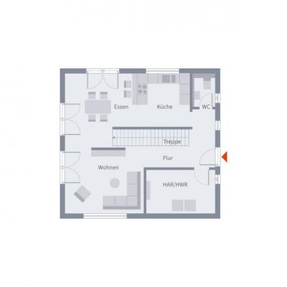 Hier wird gemeinsam gekocht, gelacht und entspannt. Ein Gäste-WC sowie der praktische Hauswirtschaftsraum ergänzen das Raumkonzept sinnvoll und sorgen für Komfort im Alltag.