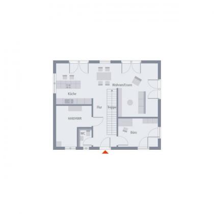 Auf rund 78 m² im Erdgeschoss verbinden sich Offenheit und Funktionalität zu einem stimmigen Wohnkonzept. Der großzügige Wohn-, Ess- und Kochbereich öffnet sich zur Terrasse und lässt Garten und Tageslicht nahtlos in den Wohnraum fließen. Büro, Hauswirtschaftsraum und Gäste-WC sind sinnvoll auf der Eingangsseite angeordnet und unterstützen einen reibungslosen Alltag.