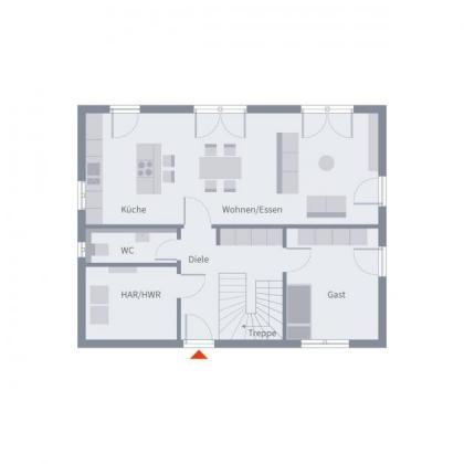 Im Mittelpunkt des Hauses steht der großzügige Wohn- und Essbereich - lichtdurchflutet, kommunikativ und vielseitig nutzbar. Hier entsteht Raum für gemeinsames Kochen, Spielen, Entspannen und Ankommen. Ein zusätzliches Zimmer im Erdgeschoss eignet sich flexibel als Gästezimmer oder Homeoffice. Hauswirtschaftsraum und Gäste-WC ergänzen das Erdgeschoss funktional und alltagstauglich.