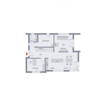 Bereits im Entrée empfängt Sie eine offene Treppe, die Gäste-WC und Hauswirtschaftsraum dezent vom übrigen Wohnbereich abgrenzt. Auch ein Büro findet hier seinen idealen Platz - perfekt für konzentriertes Arbeiten im eigenen Zuhause.