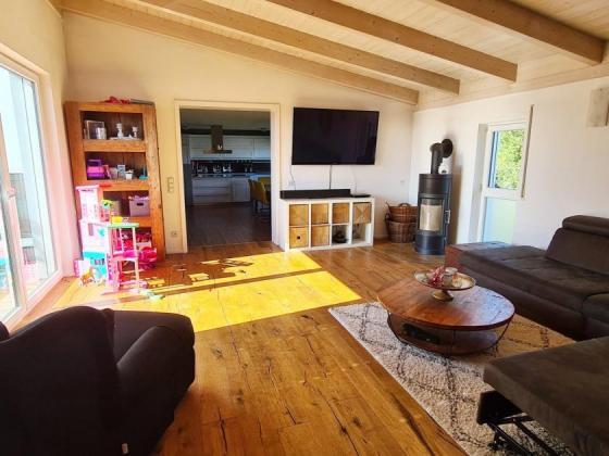 - Wohnzimmer mit Schwedenofen, offener Holzbalkendecke und Dielenboden in Eiche massiv mit Zugang zur Dachterrasse