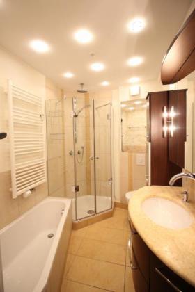 -Bad mit Badewanne plus Dusche (mit Echtglasduschabtrennung und Regendusche).