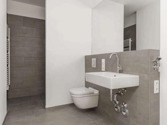 Großformatige weiß-beige Fliesen wurden an Wand und Boden verarbeitet. Zurückhaltend gestaltete Badkeramik wie der Waschtisch von Duravit „Vero“ oder das zeitlose WC „Starck3“ Rimless® stehen für klare, geometrische Formen. Ebenso zeitlos sind die verchromten Badarmaturen von Hansgrohe mit ihren puristischen Hebelgriffen. Zudem werden alle Duschen bodengleich verbaut und sorgen so für angenehmen Komfort beim Duschen.