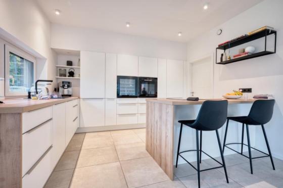 Im Erdgeschoß befindet sich der große Wohn-/Ess-/Küchenbereich, Zugang zur Westterrasse, angrenzend HWR mit der Wärmepumpe Marke Nibe und Waschmaschinenanschluss.