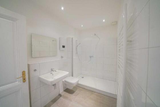 Die Wohnung ist vor wenigen Jahren, saniert worden und mit Vinylparkettboden ausgestattet. Das Badezimmer ist mit großen grauen Bodenfliesen, großen weißen Wandfliesen, einer großen Dusche mit Glastrennwand, einem Hänge-WC, einem Waschtisch, einer Handtuchhalterheizung und einem Waschmaschinenanschluss versehen. Die stilvollen Kassettentüren stammen überwiegend aus dem Baujahr und wurden aufwendig aufgearbeitet. Im Wohnzimmer befinden sich dezente Stuckelemente an der Decke. Die Küche ist mit einer hochwertigen, weißen Einbauküche mit elektrischen Markengeräten versehen (Kühlschrank und Gefrierschrank, Ceranfeld mit Dunstabzug, Backofen und Mikrowelle auf Augenhöhe sowie einer dunklen Spüle). Ein eigener Kellerraum ist ebenfalls vorhanden. Eine schnelle Internetverbindung und ein TV-Zugang sind über einen Kabel- und Telefonanschluss (Glasfaseranschluss) realisierbar. In Verbindung mit den isolierverglasten Kunststofffenstern und der Gas-Zentralheizung ergibt sich ein niedriger Energieverbrauch. Das Warmwasser wird per Durchlauferhitzer bereitgestellt.