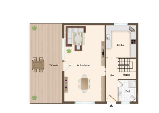 - EG: Flur, großes Wohnzimmer, Küche, Duschbad, Terrasse