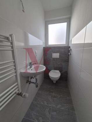 Das Badezimmer ist in zwei separate, jeweils tagesbelichtete Räume aufgeteilt. In einem Raum befinden sich das WC sowie ein Waschbecken.