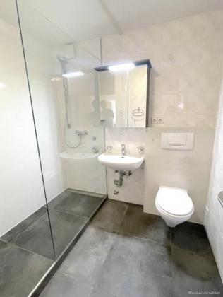 Von der Diele aus gelangt man rechts in die helle, moderne Küche und links in das ebenfalls modernisierte Bad mit schöner großer Dusche mit Glaswand.