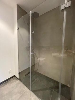 Schlafzimmer mit en Suite-Badezimmer: Das private Bad ist modern gestaltet und verfügt über eine bodentiefe Dusche sowie ein WC.