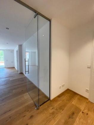 Besonders hervorzuheben sind die hochwertigen Materialien: Echtholzparkett in Eiche, elegante weiße Türen sowie eine stilvolle Glastür zwischen Eingangs- und Wohnbereich, die zusätzlich Licht und Transparenz schafft.