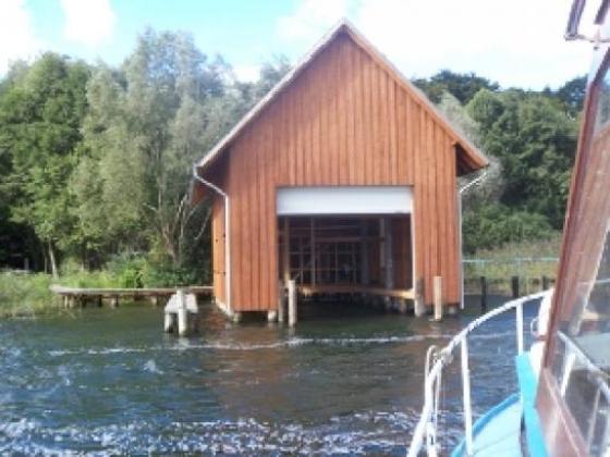 Die Perle am Schweriner See. - Bootshausneubau incl. Motorkajütboot der Superlative! Neugebautes Bootshaus am einmaligen Standort am Schweriner Innensee – Im Rücken den drittgrößten See Deutschlands und vor einem die weite Welt. Das heißt, Mecklenburger Seenplatte, Havel, Spree, Berliner Gewässer oder Elbe, Dresden, Hamburg und weiter. Am Stadtrand der Landeshauptstadt, am Schweriner See gelegen, ein einmaliges Objekt. Für die Ewigkeit aus Lärche und Eiche gebaut, mit neuartigen Leichtmetalldach in Dachsteinoptik, großzügigen Fenstern, einem Bootsplatz von ca. 5 x 12 m, einer vollmotorisierten Schiffshebeanlage, einem elektrisches Rolltor, Außenliegeplatz und eigener verschließbarer Steganlage auf voll erschlossenem Seegrundstück gelegen, leistet dieses Objekt auch den anspruchvollsten Wünschen genüge. Werden sie durch diese Fakten angesprochen, klicken Sie zwecks weiterer Beschreibungen auf die entsprechenden Buttons unserer Homepage.Das Bootshaus: Der Aufbau des Bootshauses gestaltet sich wie folgt: Ebenerdig, ca. 0,70 - 0,80 m über der Wasserlinie, befinden sich Vorbereitungen für den Ausbau der Kücke und des Bades, sowie die Treppe ins 1.OG. Der Umlauf des Bootsplatzes hat eine Breite von ca. 1,50 m. Das 1.OG hat eine Grundfläche von ca. 30 m². Von hier aus geht eine 2.Treppe ins Dachgeschoss. Hier gibt es eine Ausbaureserve von 8 x 16 m mit einer Firsthöhe von 4,5 m. Für den Fenstereinbau im DG ist das Fachwerk vorbereitet. Die Außenwandverkleidung besteht aus 25 mm Lärchenholz und der Innnenausbau aus Kiefer. Die Schiffshebeanlage ist so konzipiert, dass das Boot problemlos nach jeder Nutzung angehoben werden kann. Das Boot: Das Motorkajütbootboot mit einer Länge von 10,80 m (Bj.1973) - ehemals Repräsantivboot des Oberbürgermeisters der Stadt Schwerin, mit einer Motorleistung von 50 PS, (Diesel-Verbrauch 7L./Std.) und einer Länge von 10,80 Metern. Im Jahr 2005 wurden umfassende Decks- und Unterbodensanierungen durch die renommierte Traditionsbauwerkstatt Schubert durchgeführt. Eine neue E-Anlage wurde eingebaut und die komplette Persenning erneuert. Zugelassen ist die Yacht für 12 Personen. Es sind 4 Schlafplätze vorhanden. Zur Ausstattung: Kraftstofftank 120 Liter Dieseltank, Frischwassertank 40 l und Abwasser 60 l mit Lenzpumpe, Bordtoilette, Echolot, elektrische.Ankerwinde, Bugstrahlruder für eine kinderleichte Manövrierung und eine Dieselheizung für kalte Momente. Eine vollständige Beleuchtung, Mpeg3 / CD-Radio für ausreichende Beschallung, eine Kühlanlage mit Biertresen für Fassbetrieb. ... ...