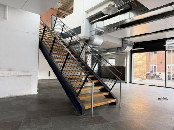 Über eine elegante, 2-läufige, gradlinige Wangentreppe gelangen Sie in das 110 m² große Obergeschoss. Große Fenster sorgen auch hier für eine helle, angenehme Arbeitsatmosphäre. Der mit Echtholzparkett ausgestattete Bereich eignet sich ideal für konzentriertes Arbeiten, kreative Prozesse oder diskrete Beratungsgespräche.