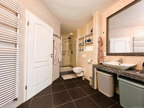 großes Badezimmer mit Wanne, Dusche und Fenster,