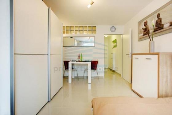 Möblierung: hochwertig und neu, moderner Stil. Es ist ein Doppelbett vorhanden (auf den Bildern ist ein Schlafsofa zu sehen, dieses wurde durch ein Bett ausgetauscht). Großer Schrank, Tisch mit Stuhlen und Regale vorhanden.
