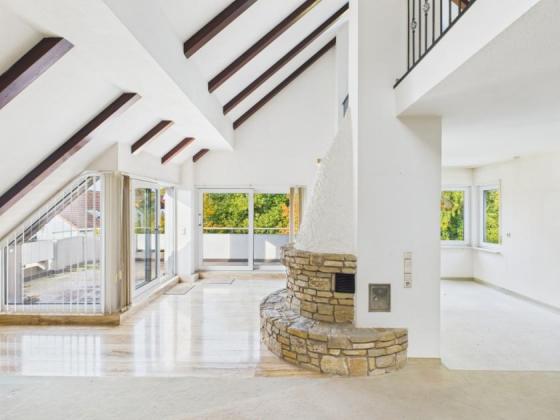 Die Wohnung erstreckt sich über zwei Etagen und verfügt über zwei Balkone, die herrliche Ausblicke und Platz für Entspannung bieten. Ein Kamin im großzügigen Wohnbereich sorgt für eine gemütliche Atmosphäre, während die Fußbodenheizung in allen Räumen Komfort und Wärme spendet.