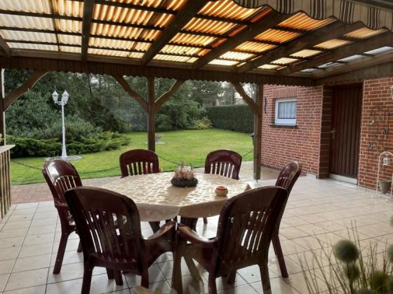 * Überdachte Terrasse mit Blick in den großzügigen Garten