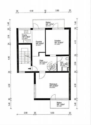 Die Wohnung verfügt über zwei Eingänge, jeweils in jeder Etage einen und überzeugt durch ihre klare Raumaufteilung.
