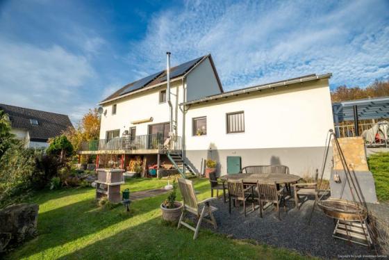 Das freistehende Einfamilienhaus wurde im Jahr 2020 umfassend saniert und zeigt sich in einer soliden Kombination aus Massiv- und Fachwerkbauweise. Es verfügt über zwei Geschosse sowie einen teils begehbaren Kellerbereich. Die Fundamente bestehen vermutlich aus Beton, die Außenwände aus Bimsstein, während die Geschossdecke als Holzbalkenlage ausgeführt ist. Das Satteldach mit 45° Neigung wurde im Zuge der Sanierung von innen mit 180 mm Dämmung versehen, wohnlich ausgebaut und mit anthrazitfarbenen Tonziegeln eingedeckt. Im Jahr 2023 wurde zusätzlich eine Photovoltaikanlage mit einer Leistung von 8,2 kWp installiert, die zur Stromeinspeisung dient.