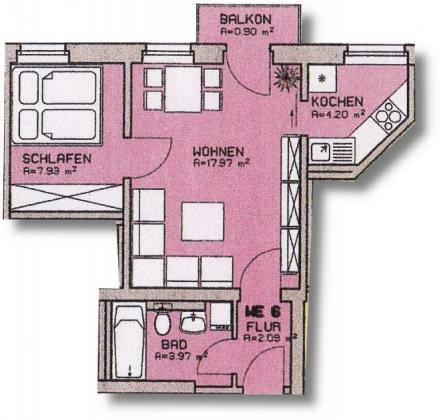 Die 1,5-Raum Wohnung mit ca. 37,69 m² befindet sich im 2. OG und ist wie folgt unterteilt: