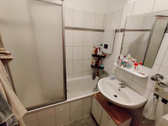 Das Badezimmer ist klassisch ausgestattet mit einer Badewanne samt integrierter Duschfunktion, einem WC und einem Handwaschbecken. Neben dem Wohnzimmer stehen ein Schlafzimmer und ein Gästezimmer zur Verfügung, wodurch die Wohnung auch für Familien oder Paare mit Homeoffice-Bedarf interessant ist. Praktische Ergänzungen bieten die Abstellkammer innerhalb der Wohnung sowie ein separater Kellerraum, die zusätzlichen Stauraum schaffen.
