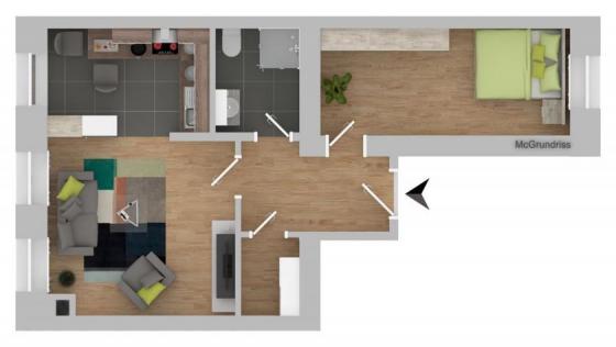 Die Wohnung ist ca. 40,75 m2 groß und umfasst ein Schlafzimmer, ein Wohnzimmer mit offener Küche und ein Badezimmer. Die Wohnräume und der Flur sind mit pflegeleichtem Laminat ausgestattet, Küche und Bad sind gefliest.