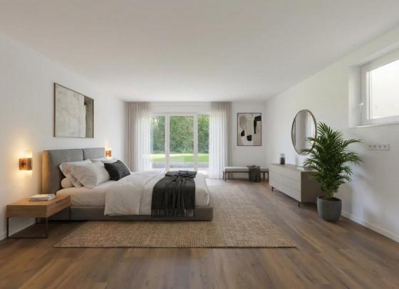 Im Erdgeschoss empfängt Sie eine großzügige Diele. Ein Gäste-WC, ein modernes Bad mit Wanne und Dusche sowie das Elternschlafzimmer mit direktem Gartenzugang bieten höchsten Komfort. Das Herzstück bildet der ca. 80 m² große Wohn-Essbereich mit offener Küche, beeindruckender Raumhöhe und bodentiefen Fenstern. Von hier gelangen Sie auf die sonnige Terrasse mit ca. 60 m² - ideal zum Entspannen.