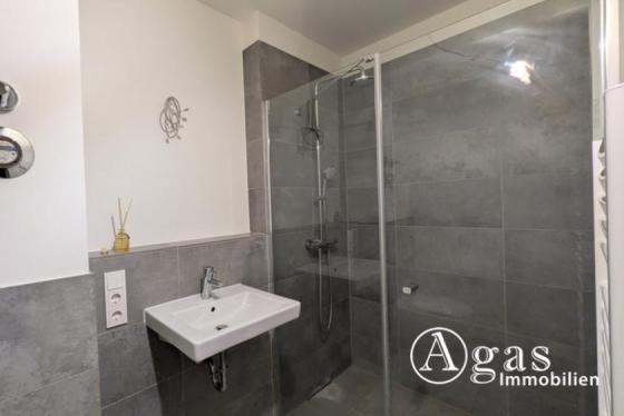 Beim Betreten der Wohnung befindet sich auf der linken Seite Platz für Garderobe und Abstellmöglichkeiten. Direkt rechts liegt das moderne Badezimmer, das mit einer großzügigen Dusche ausgestattet ist.