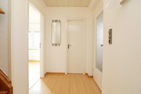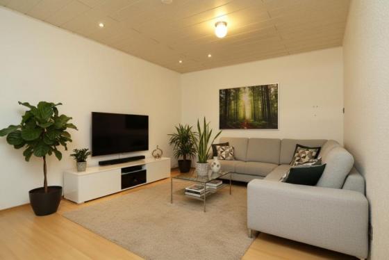 Im Erdgeschoss erwartet Sie ein Wohnzimmer mit einem großen Fenster, das eine einladende Atmosphäre schafft - ideal zum Entspannen. Angrenzend befindet sich die Küche, aktuell ohne Einbauküche. Der Wohnbereich wurde 2019 modern renoviert. Ein Badezimmer mit Dusche und Fußbodenheizung rundet das Erdgeschoss ab.