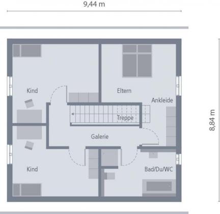 Zeitlose Eleganz außen, Weite und ein besonderes Raumgefühl innen. Unter dem Satteldach warten hier rund 135 m² auf zwei Ebenen darauf, bezogen und mit Leben gefüllt zu werden. Im Erdgeschoss ist Offenheit Trumpf: Hier erstreckt sich der große Wohn-Ess-Koch-Bereich nahezu über die gesamte Ebene, er wird nur durch die zentral platzierte Treppe von der Diele abgetrennt. Das Ergebnis: ein lichtdurchfluteter, einladender und großzügiger Bereich zum Wohlfühlen und Treffen. Im Eingangsbereich stehen zudem ein kleines Gäste-WC sowie ein großer Hauswirtschaftsraum zur Verfügung. Über die mittig gelegene Treppe geht es ins Obergeschoss. Hier ist ausreichend Raum für Eltern und bis zu zwei Kinder. Die Eltern verfügen über ein großzügig geschnittenes Reich mit separatem Ankleideraum, zwei große Kinderzimmer lassen ebenfalls keine Wünsche offen. Abgerundet wird das Raumangebot in der oberen Etage durch ein großes Badezimmer mit Dusche, Wanne und WC.