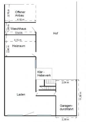 Wohen & Gwerbe, Gewerbeeinheit im Erdgeschoss, große Schaufensterflächen, separates WC, Durchfahrt zum Hof, Grundstück ca. 453 m², mehrere Anbauten, Garage, Wintergartenanbau, Vorratsraum, ehemaliger Pool, Wohnung im Obergeschoss mit zwei Zimmern, Küche mit älterer Einbauküche, großes Bad, ausgebautes Kinderzimmer im Dachgeschoss, möglicher weiterer Dachausbau, unterkellertes Vorderhaus, Gas-Zentralheizung (2009), Sanierungen zuletzt in den 1990er-Jahren, renovierungsbedürftiger Zustand, Entwicklungspotenzial.