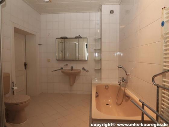 Bad gefliest mit Wanne, Dusche, Waschtisch, WC, Handtuchtrockner
