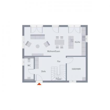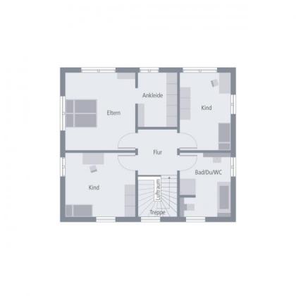 Pultdächer stehen für modernes Wohnen und für Individualität. Dass sie auch für ein ganz besonderes Wohngefühl stehen können, das macht unser Pult 12 auf ansprechende Weise deutlich: Dank der einseitig abgeschrägten Dachform entstehen im Obergeschoss Räume mit einer Deckenhöhe von bis zu 4 m: sowohl das Elternschlafzimmer als auch das große Kinderzimmer profitieren von dieser Bauweise. So haben die künftigen Bewohner das Gefühl, in einem Loft zu wohnen. Die großen Fensterfronten lassen die Räume optisch noch größer wirken und verbinden Wohnen und Natur auf durchdachte Weise. Ebenfalls in der ersten Etage: ein weiteres Kinderzimmer sowie ein großzügig geschnittenes Bad mit Wanne, Dusche und WC. Und auch diese beiden Räume verfügen über eine Stockhöhe von 2 m und bieten damit maximalen Gestaltungsspielraum. Im Erdgeschoss befinden sich unterdessen der mehr als 40 m² große Wohn-Ess-Koch-Bereich, Hauswirtschaftsraum, Gäste-WC sowie ein großer und freundlicher Dielenbereich.