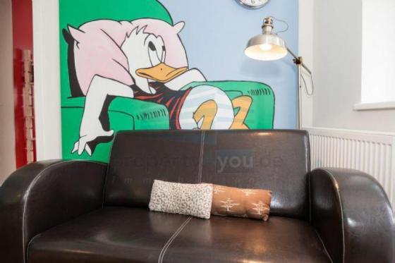 Sehr individuell eingerichtetes Apartment. Ein Wohnraum mit Zugang zum Balkon und Küchenzeile. Ein Schlafzimmer mit Zugang zum Bad. Komplett